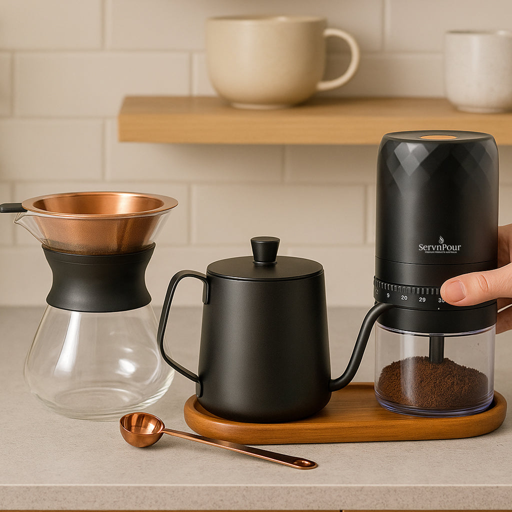 Artisan coffee gift set perfect for home baristas, coffee lovers, and anyone who enjoys café-quality pour-over coffee at home. This luxurious six-piece coffee brewing set is crafted for those who appreciate quality, sustainability, and unforgettable flavour.